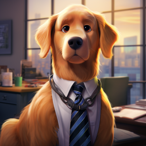 old blind golden retriever wearing a worn tie, game design, monster inc. style, pixar style modern, detective office in background