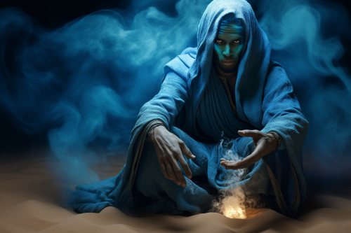 The deep azure blue smoke surrounded the ancient blue skinned African jinn and poured from his hands as he stirred the sands of the desert into a raging storm late into the desert night --ar 3:2 --s 50
