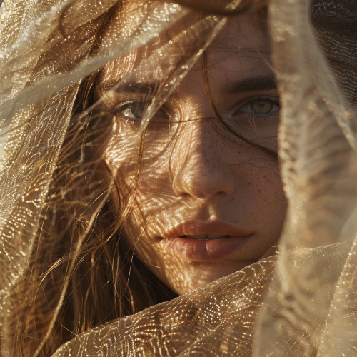 A portrait of a woman in the desert, her face partially covered by a sheer, sand-colored veil. The harsh sunlight casts shadows on her face, highlighting the textures of the sand and her skin. The image has a warm, almost mirage-like quality. --v 6.0