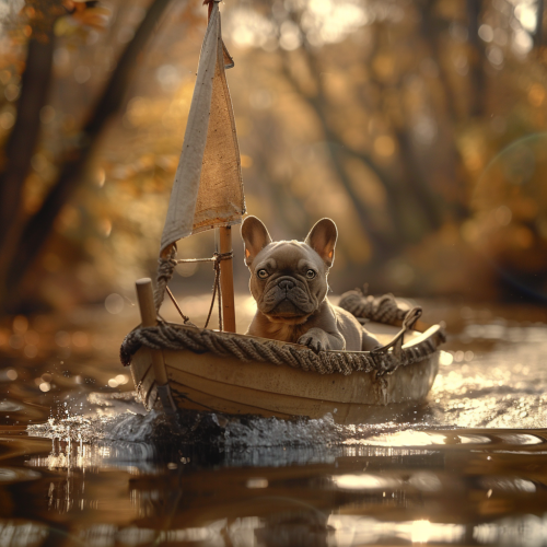 A whimsical photograph captures a French Bulldog gracefully navigating a small wooden sailboat on a calm body of water, set against an autumnal backdrop. The dog, with its distinctive facial features, light grey and white fur pattern, and prominent ears, sits upright in the center of the frame, its head slightly tilted as it looks directly at the camera with a serious, focused expression. The boat's amber-colored sail is raised, catching the warm sunlight and creating a striking contrast with the water's surface. The water creates dynamic splashes and ripples around the boat, with droplets visible as they scatter in various directions, adding to the sense of motion. The scene is bathed in soft, golden light from what appears to be late afternoon or early evening, casting a warm glow over the entire composition and creating a dreamy quality. The background features blurred trees with autumn foliage in shades of amber yellow, burnt orange, and muted browns, enhancing the serene and magical atmosphere. The water's surface reflects the golden hues of the trees and sunlight, creating a harmonious blend of colors. Small circular bokeh effects are scattered across the image, further emphasizing the dreamy quality of the moment. The overall mood is tranquil and joyful, with high saturation and moderate contrast, resulting in a balanced and visually appealing scene that captures the essence of a peaceful autumn day.--v 5.0 --ar 5:3 --s 750 --v 6.0