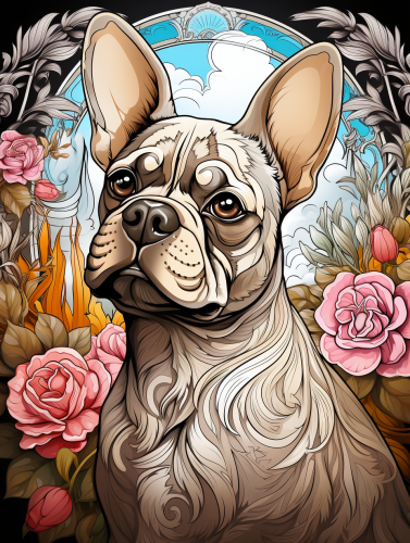 a French bull dog big expressive eyes, black and white illustration head portrait with a realism style in doodle art coloring book style with elegant black lines , filled with intricate shapes, Hollywood symbols --ar 3:4 --v 5.2 --s 750