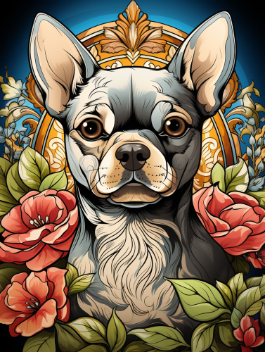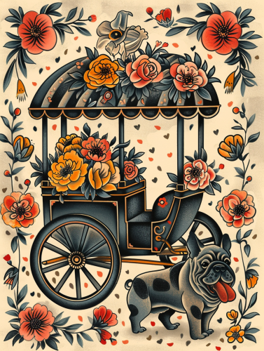 a traditional tattoo flash design of floral cart vendor in paris with french bulldog, side view, old school tattoo style, tattoo flash artwork, --ar 3:4 --v 6.0