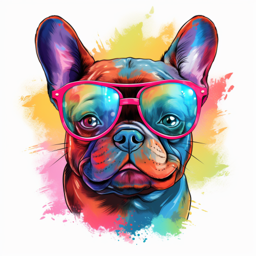 tshirt design, carton style, cute french bulldog wearing sunglasses, colorful happy dog, white background, aquarela colors