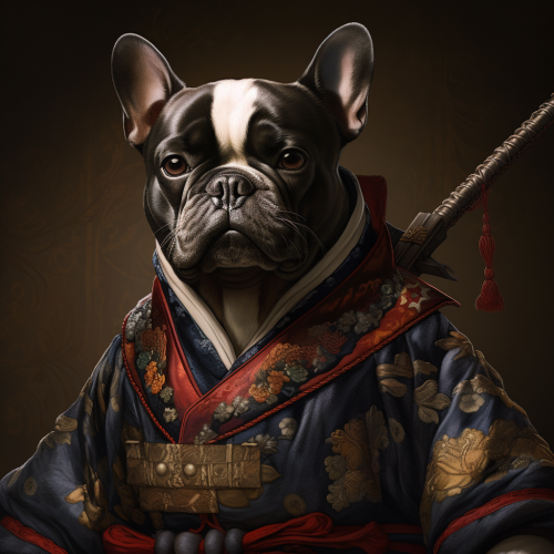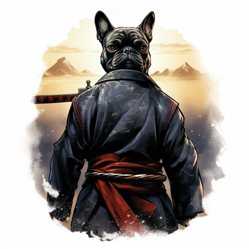 French bulldog walking away while looking back carrying a sword on his back wearing a traditional samurai, no background, t shirt design, hyper realistic
