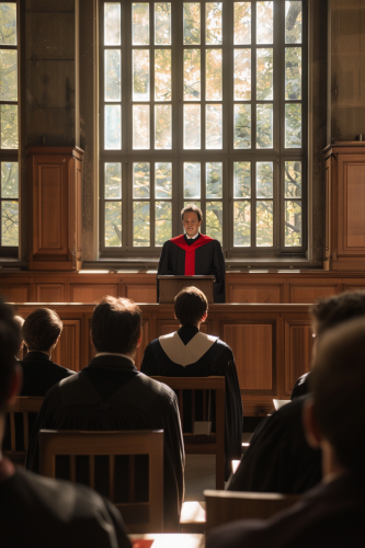 A French courtroom setting with a young speaker at a wooden lectern, judges in black robes with red sashes sit at the elevated bench, lawyers in black robes are seated nearby. The room features wooden paneling, large French windows, and traditional legal decor. Lighting is soft and formal. Created Using: documentary style, realistic textures, cinematic lighting, French legal setting, muted color palette, professional atmosphere, high detail --ar 2:3 --v 6.0