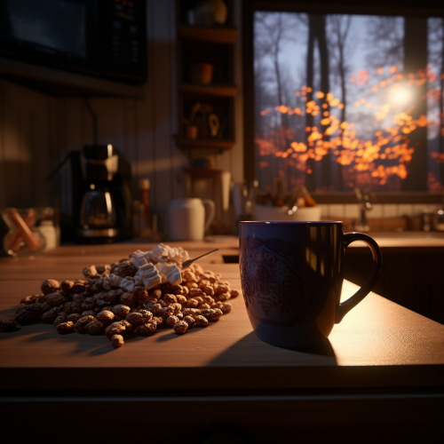 eye level view of a dark wood countertop with a cup of hot chocolate towards the side and edge, pieces of popcorn scattered over the counter. Soft lighting with a blurred background of a television screen. Photo realistic. witch's cottage style