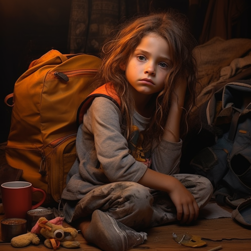 Overwhelmed by grief, the 6-year-old girl wipes away tears and makes a firm decision. She packs a small bag with camping supplies and determines to find the protection center on her own, the glimmer of determination shining in her eyes. Style is realistic.