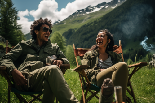 A group of gen - z students in french language chatting, sitting in a chair, in french alps countryside, laughing, having fun, fashionable, tourism chic, in the style of studyplace, national geographic photo, --ar 3:2