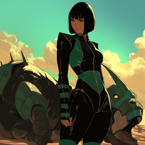 mexican woman with bob haircut standing next to a rhinceros robot, empty desert background, eerie, webtoon, comic book style --s 250 --style raw --niji 6