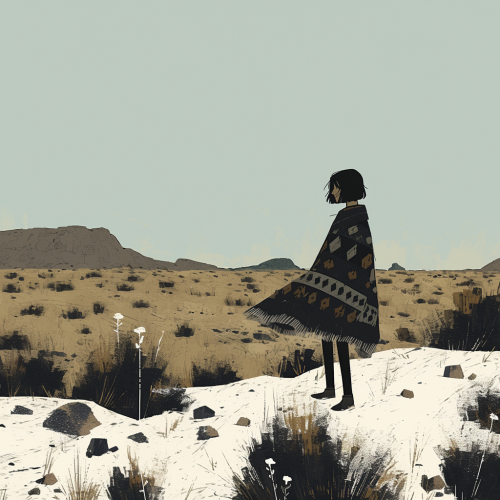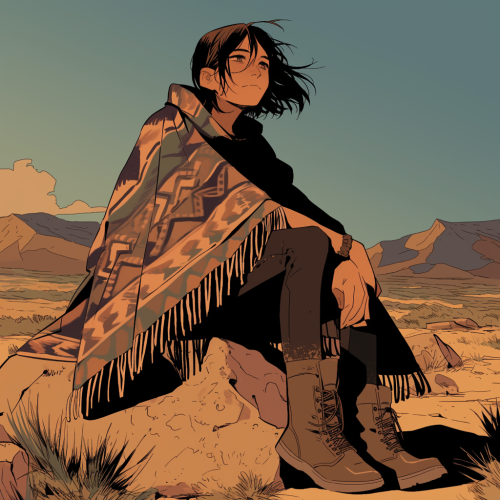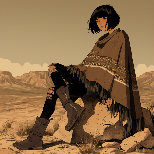 mexican woman with bob haircut sitting on a rock, wearing rugged poncho, boots, empty desert background, eerie, webtoon, comic book style --s 250 --style raw --niji 6