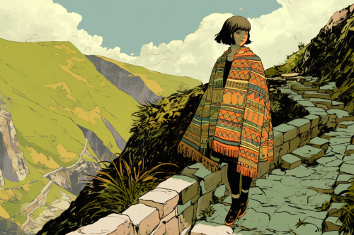 woman with bob haircut wearing a poncho, walking on a path on the steep of a peruvian mountain, ancient stone walls, poncho with paracas pattern, bright colors, webtoon, comic book style --ar 3:2 --s 250 --style raw --niji 6