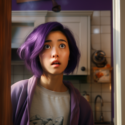 young Korean woman with purple bob haircut surprised expression standing in the doorway to a kitchen