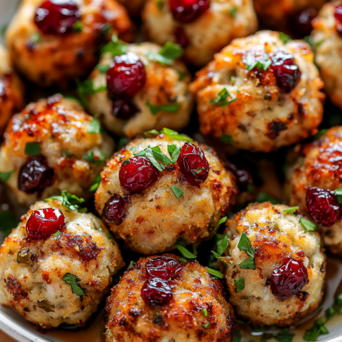 Close-up of a plate of golden-brown cranberry and turkey stuffing balls, garnished with chopped green herbs. Each stuffing ball is dotted with cranberries, giving a festive and colorful appearance, perfect for holiday gatherings. The dish is served with a light drizzle of savory sauce, which pools slightly around the edges, adding a glossy, appetizing look. The lighting is warm and inviting, highlighting the crispy edges and tender texture. Text overlay includes 'Cranberry/Turkey Stuffing Balls' with a list of ingredients, featuring chicken broth, dried thyme, and salt