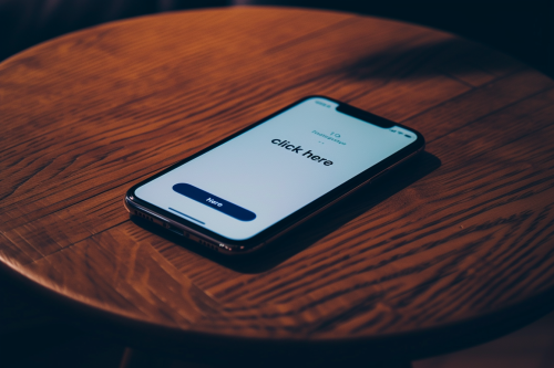 an iphone on a wooden table. There is a push notification displayed on the phone, with the simple text "click here". It is laid on a wooden table. --ar 3:2 --v 6.0