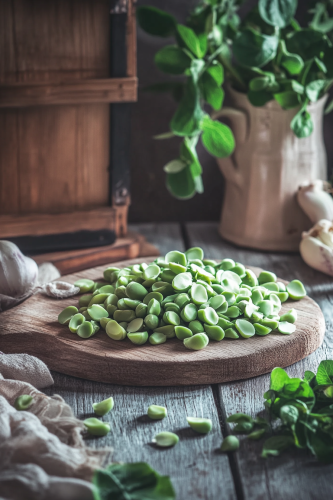broad beans, green and white colored, on the table. Amaizing decorations in background. There are some fresh fava beans in front of them. A few loose bean seeds are scattered around them. The background wooden tabletop creates an atmosphere of spring or summer dining. High-resolution very positive and light photography. This photo was taken using a Canon EOS R5 camera with a standard lens to capture every detail in a wide-angle and full-frame shot, using natural light. It has high sharpness and clear focus. --ar 2:3