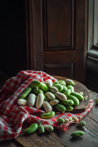 fresh green broad beans, and white colored, on the table with a red checkered cloth. A few loose bean seeds are scattered around them. The background wooden table creates an atmosphere of spring or summer dining, natural light. It has high sharpness and clear focus. --ar 2:3 --style raw