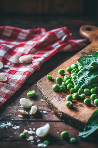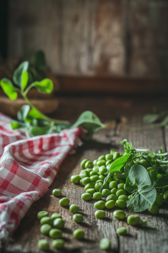 Broad beans on a table, with a red and white checkered cloth and a wooden background. Close-up of fresh green peas with leaves, and some loose lima bean shells scattered around. Macro photography, high-resolution photography, professional photograph, professional color grading, soft shadows, low contrast, clean sharp focus, and a bokeh effect. --ar 2:3