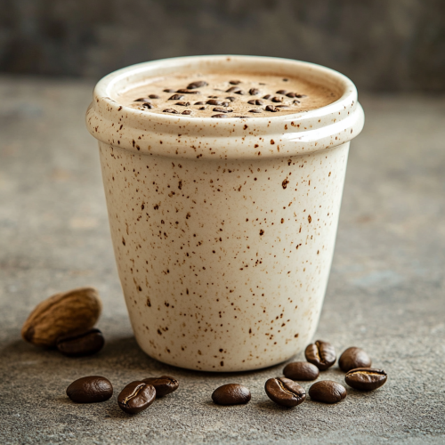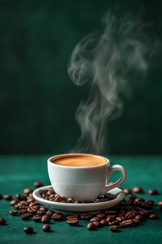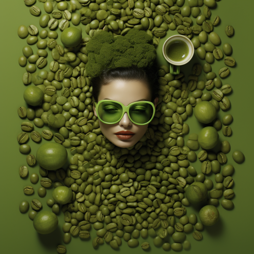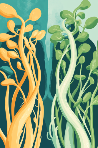 illustration of raw green and yellow-brown beans between long sprouts, a brand logo is visible on top of itThe background is blue, with some elements in light orange, yellow, or turquoise. --ar 2:3 --style raw