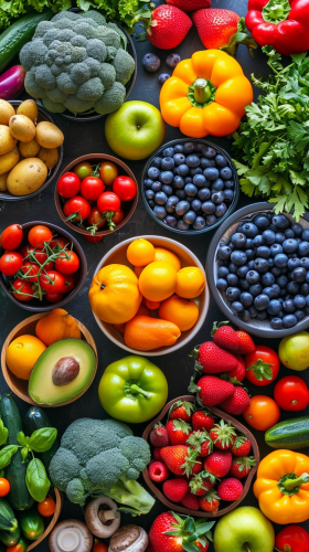 A colorful spread of fresh, whole foods displayed on a wooden table, including fruits, vegetables, lean proteins like grilled chicken, nuts, and whole grains like quinoa, in a vibrant, natural setting. The image exudes health and vitality with a close-up focus on the textures and colors of the ingredients.