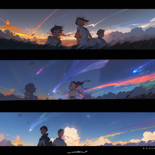 your name anime two couples holding hands each other wearing kimono and looking at the night sky ,falling comets in throught the sky, anime style, high fantasy, digital art, masterpiece painting, ultra detailed, ultra high definition, 8K resolution, 3D shading, superior quality, cover illustration, complex design, luminous highlights, rich vibrant colours, hyperrealistic, meticulously hyper detailed, high contrast, artstation --s 750 --niji 5 --style expressive