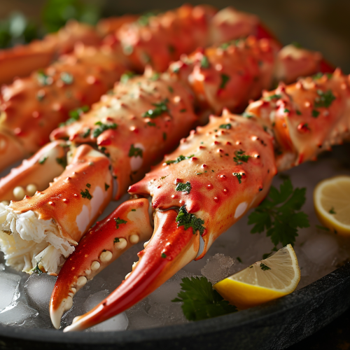 DESCRIPTION: Alaskan King Crab Legs: Picture sumptuous Alaskan King Crab Legs, colossal and vibrant, their shell a striking blend of deep red and burnt orange hues. Arranged on a bed of crushed ice, each leg showcases its impressive size and the promise of succulent, sweet meat within. Simple garnishes like lemon wedges and fresh herbs. | STYLE: Medium Close Up | GENRE: Roadside Diner | EMOTION: Bright and vibrant | TAGS: High-end food photography, clean composition, luxurious, elegant, mouth-watering, indulgent, gourmet | CAMERA: | Canon EF 70-200mm f/2.8L IS III USM lens on a Canon EOS 5D Mark IV camera | FOCAL LENGTH: 105mm | SHOT TYPE: Full shot | COMPOSITION: Centered | LIGHTING: Hard Fill Lighting - A second light source that fills in shadows created by primary light source for commercial and fashion prompts. | PRODUCTION: Food Stylist | TIME: Afternoon | LOCATION TYPE: Seafood Restaurant Interior --v 6.0 --style raw --stylize 250