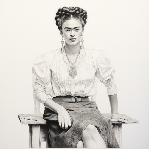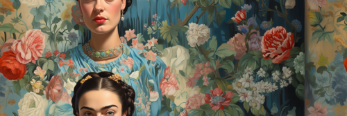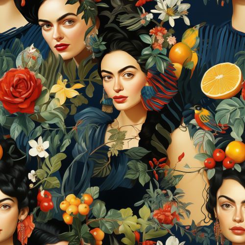 a painting of frida kahlo with bule house, in the style of rustic naturalism, strong facial expression, naturalistic, meticulous attention to detail, naturalistic --s 250 --tile --ar 3:1