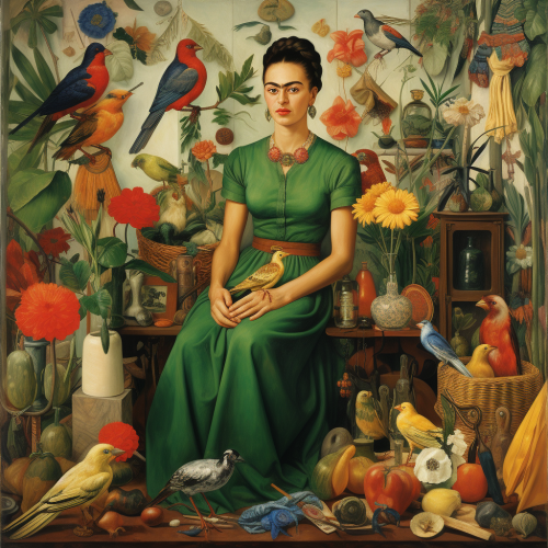 A majestic peacock with its vibrant tail feathers spread wide, set against a glowing sun on the horizon, inspired by the artistic style of Frida Kahlo. The background includes lush, surreal flora and symbolic elements, creating a dreamlike, mystical atmosphere. The peacock’s feathers feature vivid blues, greens, and golds, with intricate details reminiscent of Kahlo’s use of color and symbolism. The composition feels warm and rich, with bold contrasts and a surreal ambiance that captures the introspective depth and nature-inspired essence of Frida Kahlo’s work. This prompt incorporates her influence and focuses on a surreal, symbolic composition. --q 2 --s 750