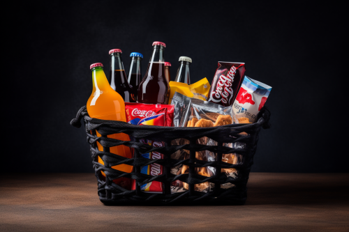 Shopping basket made of fabric with carrying handles, in the basket only a bottle of soda and a bottle of Cola and a to-go coffee cup and a pack of cookies and a bag of gummy bears and a rolled magazine, dark slate background, --ar 3:2