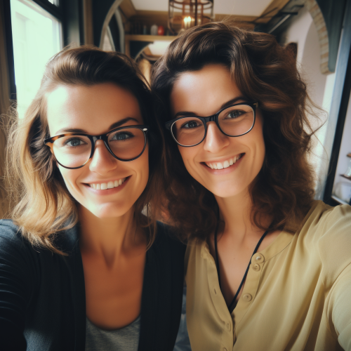 realistic photo of two friendly and approachable looking professional women taking a picture together - the photo was taken on a phone so you can see slight imperfections in both individuals, the two women appear to be from different ethnic backgrounds. They are standing a few feet appart and one of them is waving at the camera