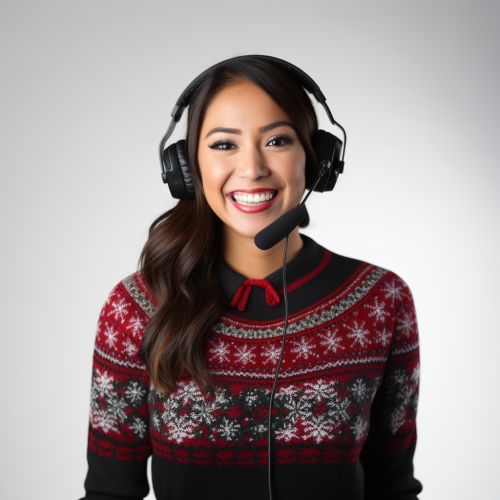 a scene where there's this friendly Asian female working as a receptionist. Picture him in this totally photo-realistic style, rocking a holiday sweater with all the tacky, festive vibes. You can't miss the small headset he's got on, mic right by his mouth. The lighting is all bright and daytime, and he's standing against this clean white background. But here's the thing: he's not posing or anything. He's just casually looking away from the camera, flashing this big, genuine smile. It's like catching a real moment, you know? Just that perfect mix of professional and festive, making you feel right at home.