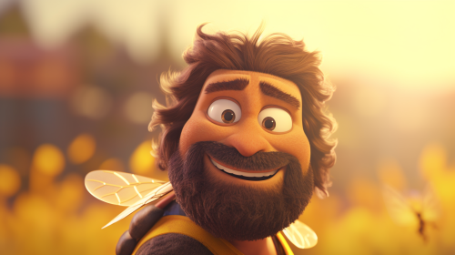 An anthropomorphised pixar style bee with a mans head - the man should look like zach galifianakis and have a friendly smiling face. The background is soft and defocused but a sunny day. photorealistic, cinematic --ar 16:9