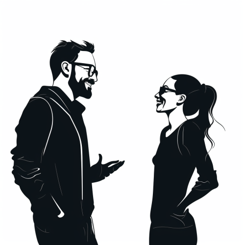 close shot of a male and female couple of designers having a friendly amusing chat, minimalist flat black and white illustration, pure white background, simple lines, high contrast