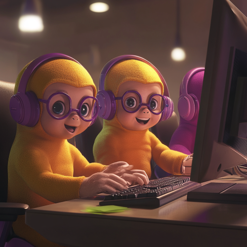 Teletubbies, muscular and strong, wearing wireless headsets and reading glasses, sitting in front of a computer. The Teletubbies should be vibrant and colorful, with exaggerated muscles, and the computer screen showing a bright interface. The background should be a mix of their original playful setting and a modern office environment. The style should be a blend of cartoonish and realistic, with detailed facial expressions and dynamic lighting.