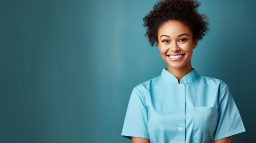 Photo vertical portrait of young happy homecare nurse wearing a blue scrub --ar 16:9