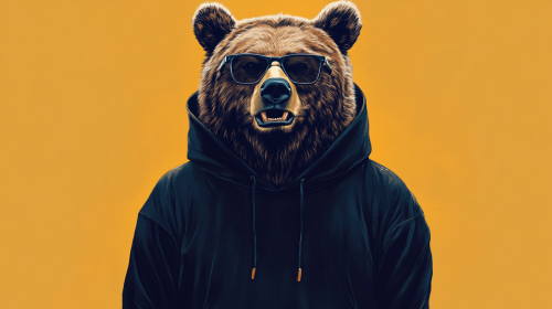 a grizzly bear standing in a black hoodie wearing glasses, snarling, dark, detailed, facing forward, close up, yellow background, solid color background --ar 16:9