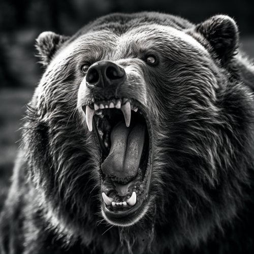 black and white photography,close up of a grizzly bear's head, extremely savage with large teeth , snarling with mouth wide open , spit and drewl