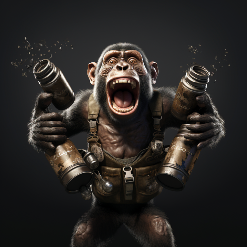 Monkey holding two grenades, photorealism, monkey with angry screaming face, grenades shown realistic and ultra detailed