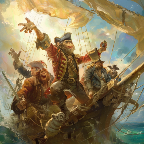 a funny cute pirate monkey with a banana in one hand and a bomb in the other, cartoon style --ar 2:3