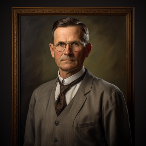stylized drawing of A man stands in the foreground looking at a framed portrait hanging on the wall. The setting is filled with gothic furniture and bookshelves. Haunting mood, eerie, creepy, existential dread. In the style of flat design vector illustration, royalty free vector illustration, minimal, silk screen, Saul Bass, Tom Whalen, Oktopolis, simple, vector, minimalist cartooning, stencil, retro, limited color palette --stylize 500 --ar 2:3 --no windows, no city, no trees