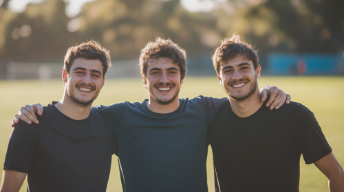 Three soccer players with arms around each other, smiling expressions, posed portrait photo, showcasing team spirit, background of a football field or natural light setting, intimate interaction between teammates, lively and candid composition, high resolution, sunny atmosphere, conveying vitality and friendship. --ar 16:9 --style raw