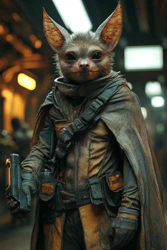 White bat hybrid humanoid with a futuristic weapon in his hand, standing in a dark area of a futuristic underground tunnel, realistic cinematic style.