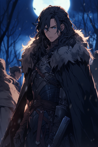 Anime style, young king in the north, 45 years old, game of thrones inspired, short greying brown hair and bushy moustache, blue eyes, muscular, large scare running across his face, wearing leather brigandine, large pauldrons and fur pelt cloak over chainmail, standing on a battlefield at night, lit by moonlight --ar 2:3 --niji 5