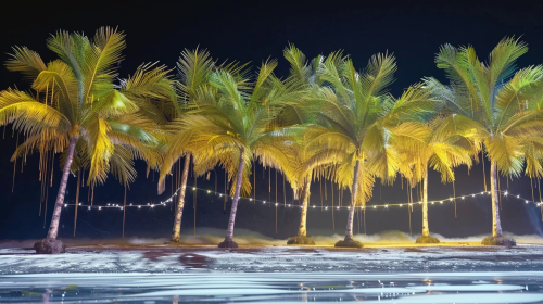 Palm trees on a moonlit deserted island beach, string lights twinkling between fronds, tropical, serene, magical, surrounded by soft sand and gentle waves, creating a enchanting and dreamy atmosphere, long-exposure photography style, soft moonlight blending with warm glowing lights, cool blue tones contrasting with warm yellow lights, Canon EOS R5 capturing the nighttime scene, 24mm wide-angle lens for a expansive view, --ar 16:9 --v 6.0 --stylize 200 --chaos 20 --weird 300