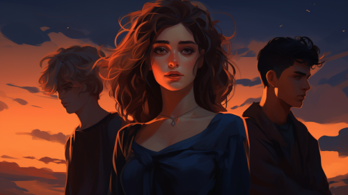 3 male and female friends far away, platonic, journey, evening, dark blue and reddit orange color --ar 16:9