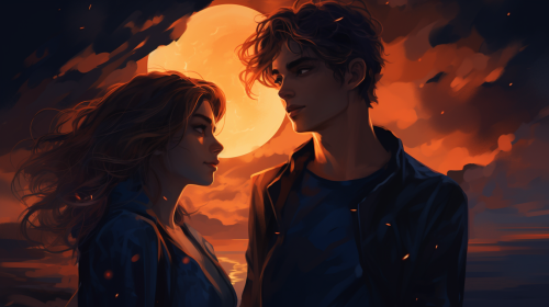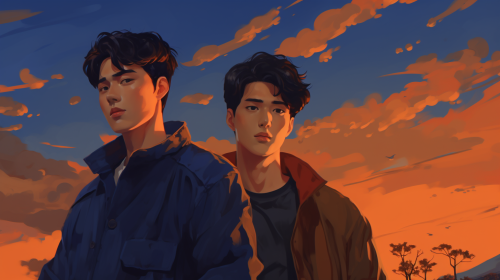korean handsome friends, journey, evening, dark blue and reddit orange color --ar 16:9