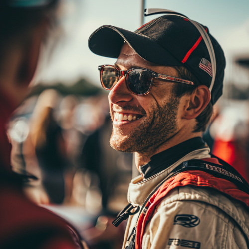 A wide shot in landscape format of a club racing driver in the paddock. He's surrounded by sponsors/friends and they are all smiling and enjoying themselves. You can see race cars in the background. Real photo. 50mm. Realistic. Candid photo. --v 6.0