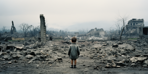 Frightened child amidst burning ruins