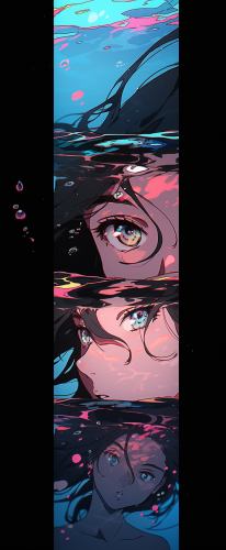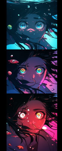 side view of girl swimming under water with a frightened look on her face in different colors, in the style of warped, dark cyan and pink, grimcore, vivid color palette, collages, tachisme, bombacore --ar 53:128 --niji 5