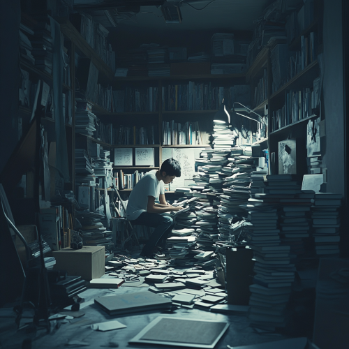 A realistic comic art style scene set in 1940s Turkey, depicting elderly Raif from 'Madonna in a Fur Coat' by Sabahattin Ali. 16:9 aspect ratio, showing a wide view of a dimly lit, modest bedroom. Raif lies asleep in a narrow bed positioned against the far wall, appearing small and vulnerable in the distance. In the foreground, dominating the right side of the frame, sits the silhouette of a man watching over Raif. This figure is intentionally ambiguous - it could be Raif's younger self, or perhaps a metaphorical representation of his memories or regrets. The silhouette is solid black, its edges slightly soft, adding to the dreamlike quality of the scene. Raif, now in his sixties, is barely discernible in the distance but his frail form can be made out under a thin quilt. His grey hair is a pale spot against the pillow. The small details of his face are not visible from this distance, leaving his expression to the viewer's imagination. The room is illuminated by a combination of faint moonlight streaming through a partially curtained window and the warm, soft glow of a distant street lamp. This creates a play of cool blues and silvers contrasted with muted golden tones, casting long, atmospheric shadows across the room. The color palette is predominantly cool and muted - deep blues, greys, and pale silvers, with touches of warm golden light adding a nostalgic feel. The contrasts are soft, adding to the dreamy atmosphere. Sparse furnishings are visible: a small nightstand by the bed, a writing desk in one corner, and a wardrobe against another wall. On the wall above Raif's bed, a faded painting of a European cityscape is barely discernible, a distant echo of his past. The blend of 1940s comic art style and photorealistic details is maintained, with subtle Ben-Day [...]