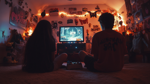 a little girl holding a lollipop with curly black hair in a dark bedroom at night sitting cross legged on the bed with a monster sitting next to her. The girl is laughing and holding a large lollipop with bright colors in a swirl pattern. The monster reaches for the lollipop with a creepy smile on its face. The only light in the room is from the door that is ajar. The hallway light is on and a small amount of light is shining into the kid's room. This image is in the style of a Stanley Kubrick film --v 5.2
